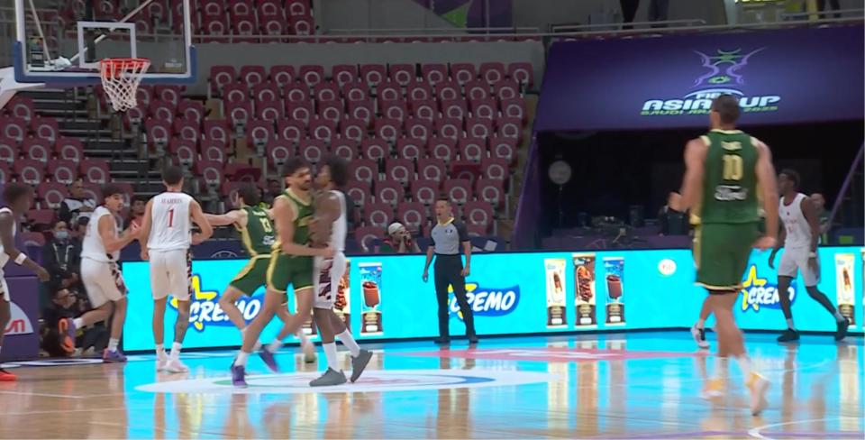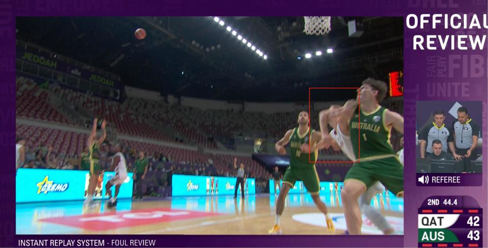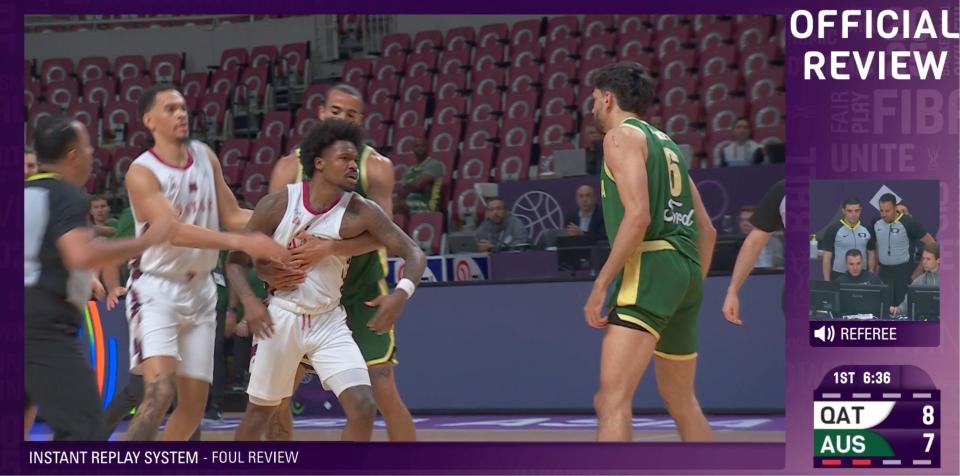 比赛伊始,卡塔尔队展现出良好竞技状态,以4:0取得开局领先。澳大利亚队在防守端出现短暂松懈,但随即通过内线强攻稳住局势。首节进行至6分36秒时,场上出现争议性判罚:澳大利亚球员在退防过程中与古德温发生身体接触,裁判经录像回放后判罚澳大利亚队违体犯规,同时对古德温及卡塔尔主教练各吹罚一次技术犯规。