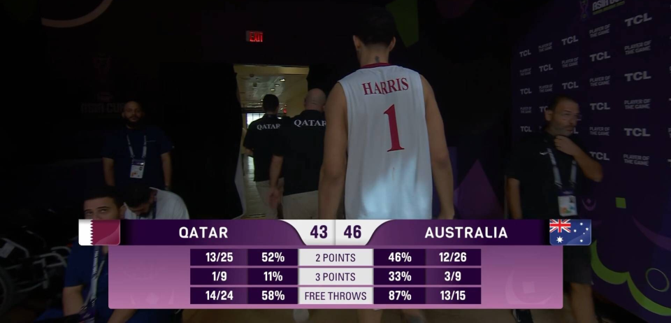 值得注意的是,卡塔尔队因阵容深度不足,始终无法让古德温获得充分休息,导致其体能消耗严重。反观澳大利亚队采用11人轮换阵容,通过人员调整保持防守强度。半场结束时,双方比分依然紧咬,比赛呈现胶着态势。